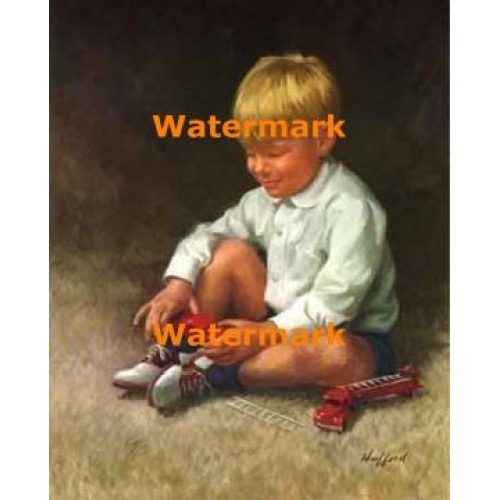 Boy playing with toy cars by Hufford titled The Favorites