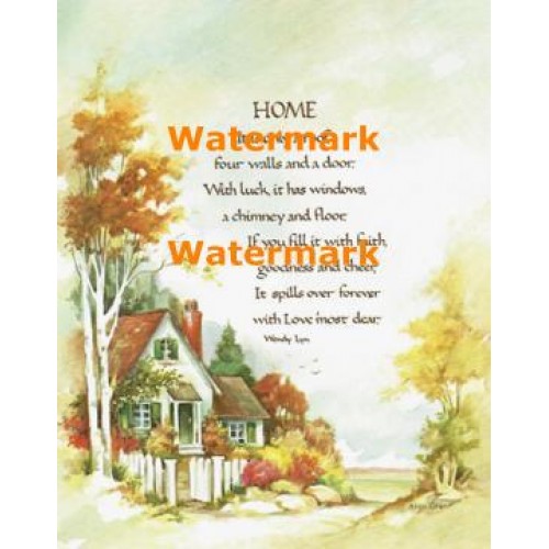 On Print: "HOME It is only a roof, four walls, and a door. With luck, it has windows, a chimney and floor. If you fill it with faith, goodness and cheer, It spills over forever with Love most dear. Wendy Lyn"