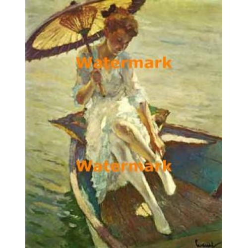 Woman in rowboat with parasol by E. Cucuel