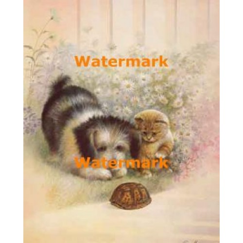 Cat and dog watching turtle shell by Ruane Manning titled I Think It Moved