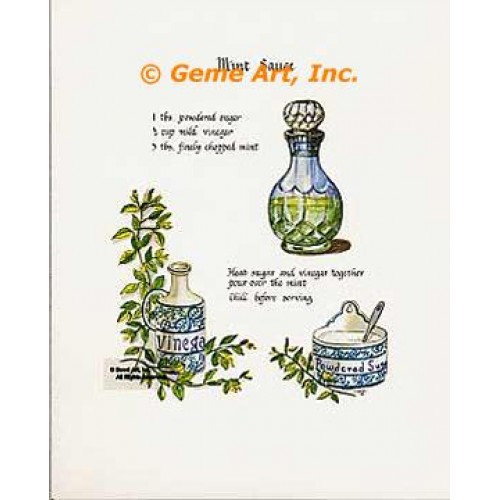 On Print: "Mint Sauce 1 tbs. powdered sugar 1/2 cup mild vinegar 3 tbs. finely chopped mint Heat sugar and vinegar together pour over the mint Chill before serving"