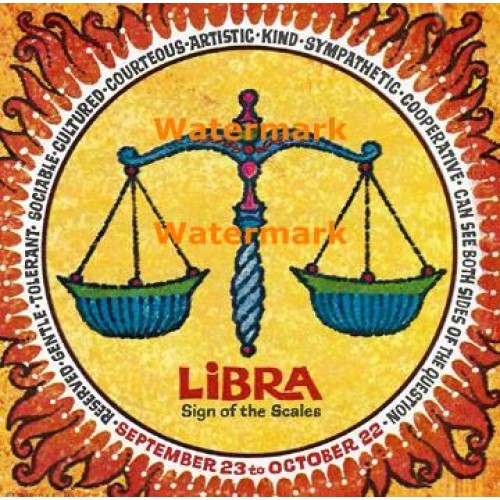 On Print: "LIBRA Sign of the Scales. SEPTEMBER 23 to OCTOBER 22. RESERVED. GENTLE. TOLERANT. SOCIALABLE. CULTURED. COURTEOUS. ARTISTIC. KIND. SYMPATHETIC. COOPERATIVE. CAN SEE BOTH SIDES OF THE QUESTION. "